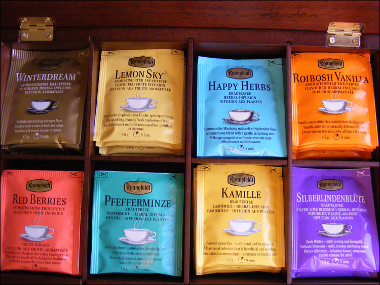 자, 이러이러한 차들이 들어 있으니 자세히 보시라. 저 페퍼민트의 철자, 독일스럽다[Pfefferminze]. 캐모마일도 마찬가지[Kamille]. 움라우트 붙은 이름도 다 있다. 과연 독일인들이 만들어 티백 포장도 자기네 자동차만큼이나 탄탄하다. 과일차들은 과일 홍차와 달리 향만 요란하고 맛은 빈약해 썩 즐기지 않는 편인데, 향초차 중에서 고전 중의 고전인 페퍼민트와 캐모마일만은 안 떨어뜨리고 꼭 쟁이고 있다. 지금껏 마셔본 수많은 페퍼민트와 캐모마일과 좋은 비교가 되겠구나 싶었다. 일단 페퍼민트는 훌륭했다. 페퍼민트 특유의 향 밑에 무엇인지 모를 우아한 지속음이 깔린다. 보라색 포장의 실버라임 블로썸에서는 달콤한 아까시꽃 향이 난다. 나머지 차들은 천천히 맛보면서 틈날 때마다 이 글 밑에 추가해야겠다. 위에서도 말했듯 티백이지만 가루가 남지 않아 목넘김이 부드럽다는 것이 로네펠트 인퓨전들의 가장 큰 장점이 되겠다. 홍차는 또 어떨지 궁금하다.
