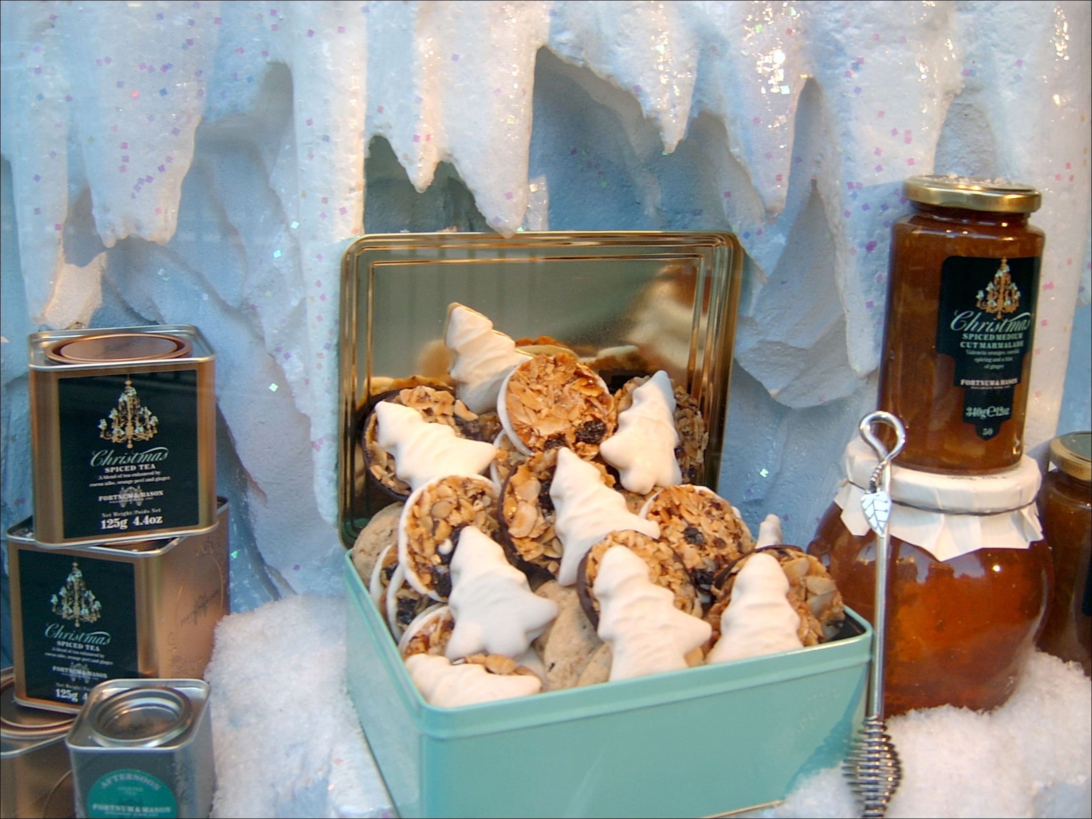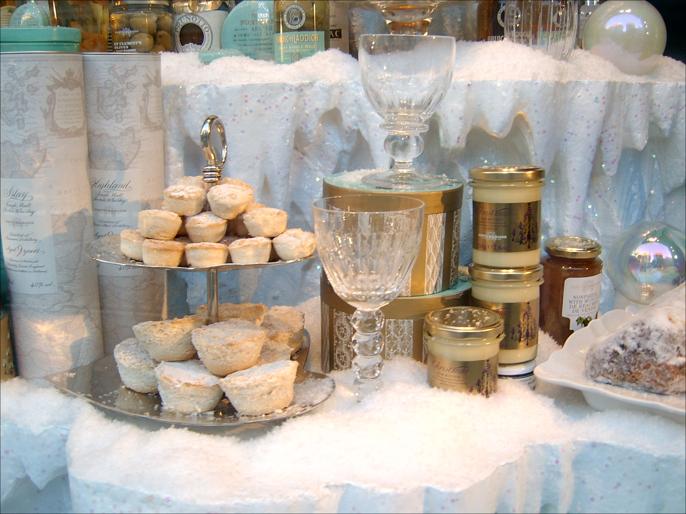 2단 접시에 민스 파이 담아 놓은 것 좀 보세요. 잼이나 스프레드, 절임 등 각종 조제 식품들도 보이는데, <포트넘 앤드 메이슨>은 홍차로도 유명하지만 이런 고급스러운 조제 식품들로도 유명해요. 여왕이 이곳 조제 식품들을 좋아한다고 해요.