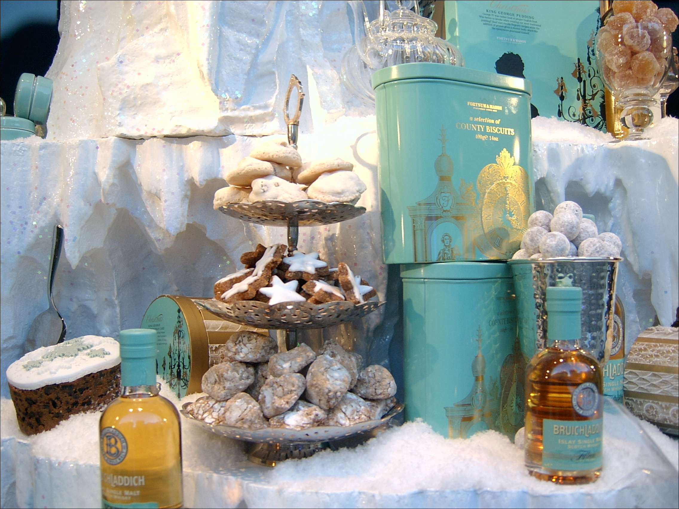 보내드릴 크리스마스 홍차 두 통 사 갖고 나오면서 이번에는 진열장을 찍어봤는데, 어이구, 연식이 좀 된 느려터진 똑딱이로 뱅뱅 도는 저 회전 테이블 찍느라 아주 죽는 줄 알았어. 사진 좀 흐려도 그러려니 하시구랴. 저 크리스마스 과자 정말 예쁘지 않아요? 어쩜 과자를 저렇게 만들 수가 있는지. 표면에 울퉁불퉁 줄도 다 넣고. 내 지금까지 살면서 트리 모양 과자 수없이 많이 보았어도 저렇게 장식도 없이 심플하면서 예쁜 건 처음이에요. 가만 보니 영국 디자인의 특징인 것 같기도 하고. 투박한 아름다움 말예요. 빵이나 케이크에 글레이즈로 광내거나 과하게 장식하는 걸 별로 안 좋아하는 것 같아요. 제과·제빵 책들을 봐도 손으로 만든 티가 역력한 것들을 선호하는 듯하고요. 일부러 과자 부스러기를 접시 한 쪽에 슬쩍 흘려 두기도 하더라고요. 하여간 내 여건만 되면 언젠가 제과·제빵 꼭 배우고 말 겁니다. 왼쪽에 크리스마스 홍차통 또 보이죠?