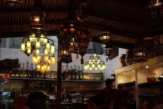 내부는 이렇습니다. 술을 따르고 있는 직원 위로 보이는 알록달록 호리병들은 아라비아의 물담배인 '시샤'라고 합니다. 파이프 물고 시샤 피우고 있는 사람을 볼 때마다 꼭 관악기 불고 있는 연주자 같아 호기심에 한참을 들여다보게 되죠. 여기서 잠깐 시샤에 대한 토막 공부.
