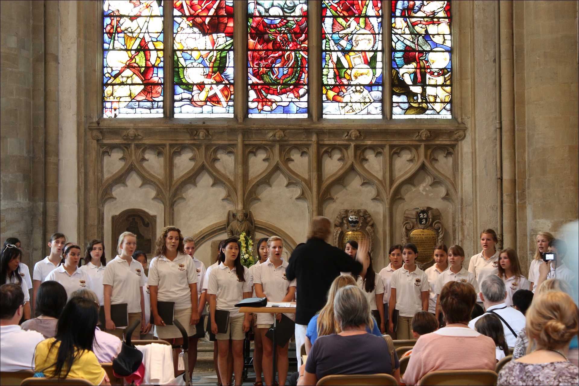 이제 음악 소리의 진원지를 찾아갑니다. 이곳의 상주 소년 성가대와 컬리지 학생들로 구성된 합창단 같지는 않고 초청된 아마추어 중창단인 듯 보입니다. 어린 여학생들로만 구성되어 있습니다. 현재 왕성한 활동중인 영국의 성가 전문 작곡가 존 러터John Rutter의 <내 눈을 여소서Open thou mine eyes>를 연주하고 있었는데, 다른 곡들은 제목을 몰라 소개를 못해드리겠네요. 교회 전속 소년 성가대인 코리스터 제도를 가장 잘 보존하고 있고 가장 많은 수를 보유하고 있는 나라가 바로 영국입니다. 의외죠? 마치 가톨릭의 본부가 있는 저 이태리쯤 될 것 같은데 말입니다. 지금 재생되고 있는 연주는 작곡가 자신의 지휘로 캐임브리지 학생들이 부르는 연주입니다. 사진은 옥스포드 컬리지 교회를 올려 놓고 음악은 캐임브리지 학생들 연주를 걸어 놓다니요. ㅋ