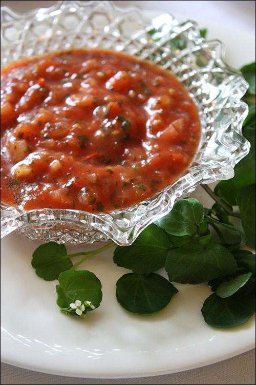 토마토를 큼직하게 썰어 내는 대신 먹기 좋게 살사salsa로 내봅니다. 쌉쌀한 물냉이watercress는 새우나 생선을 먹을 때 같이 먹으면 좋습니다. 사다가 씻기만 해서 그냥 내는 일종의 잎샐러드로 호스래디쉬와 비슷한 맛이 납니다.