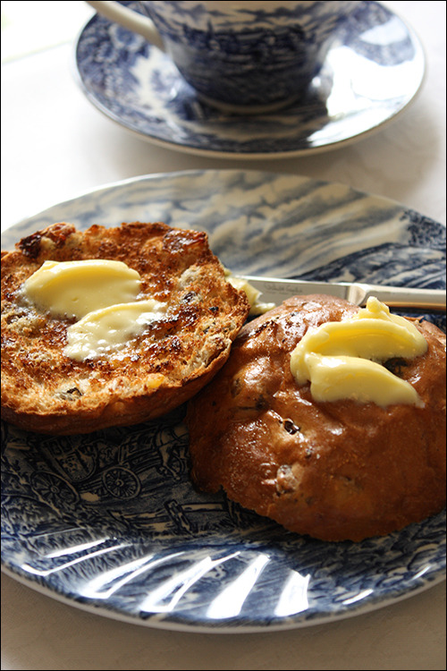 <티케이크>입니다. 케이크가 아니라 <홋 크로스 번> 같은 번 종류입니다. 헷갈리기 쉽죠. 토스터로 바삭하게 구워 버터를 발라 먹습니다. 영국인들이 아주 좋아합니다. 옛날에는 다들 벽난로에 구워 먹었다고 합니다. 벽난로 앞에 떨어져 앉아 포크같이 생긴 긴 꼬챙이 끝에 식빵이나 티케이크를 꿰어 구워 먹곤 했다는데, 지금도 BBC 골동품 프로그램인 <Antiques Road Show>에 이 꼬챙이들이 심심찮게 등장하곤 합니다.
