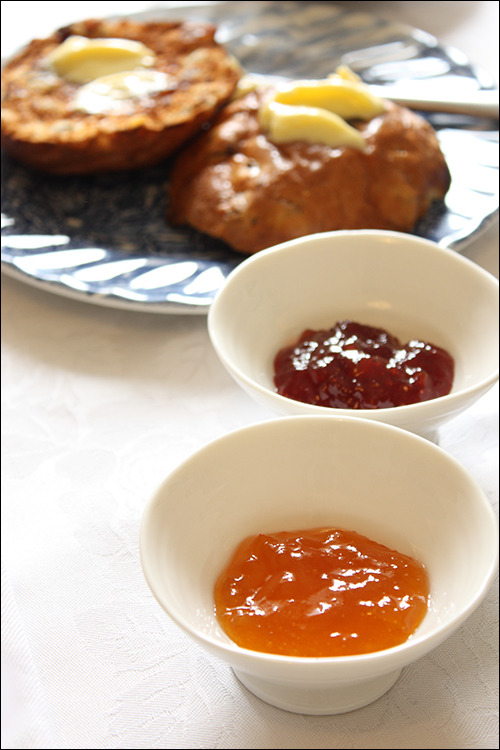 오트밀 씨리얼도 낸다는데 그것까지 내면 너무 배 부를 테니 간단하게 오트밀 비스킷으로 대신합니다. 영국에서는 치즈에 곁들이는 크래커로 담백한 워터 비스킷을 많이 쓰는데, 이 묵직한 오트밀 비스킷도 몸에 좋고 풍미도 좋아 많이들 선호합니다. 까만 열매는 포도가 아니라 자두의 일종인 댐슨damson입니다. 작아서 한입에 먹히니 일반 자두보다는 편합니다.