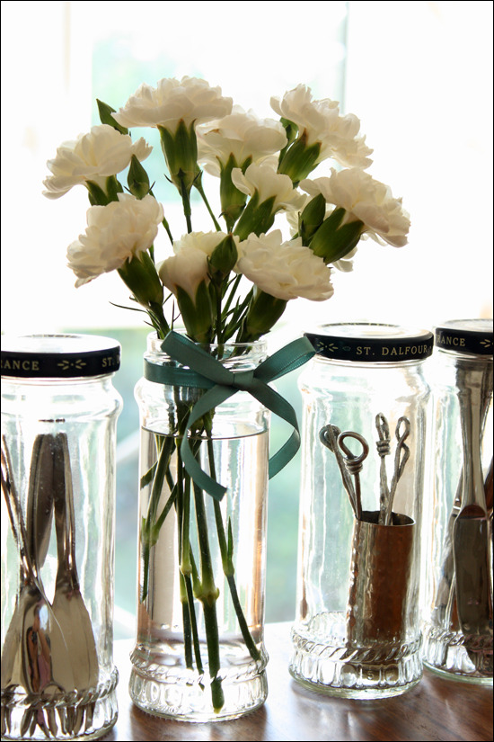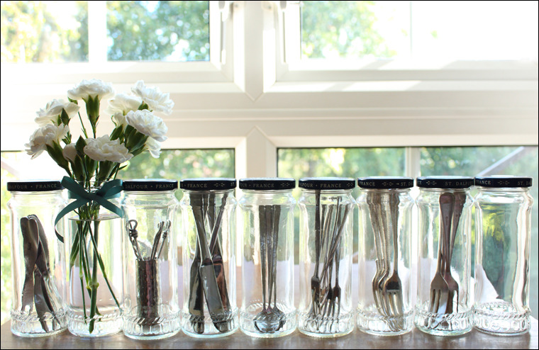 이 잼병을 저는 이렇게 쓰고 있습니다. 소스 담는 용도 외에 주로 작은 티 포크나 티 스푼, 버터 나이프 같은 커틀러리를 보관하는 데 쓰거나 꽃병으로 쓰는데, 독자분들은 예쁜 잼병들을 어떻게 활용하시는지 궁금합니다. 좋은 아이디어 있으면 귀띔 좀 해 주세요. 이 빈병 활용의 묘미는, 원래 담겼던 것과는 전혀 다른 이질적인 무언가를 담았을 때, 그 담긴 물건과 담은 병의 궁합이 의외로 잘 맞아 마치 처음부터 자기 짝인 양 어울리고, 이것이 담는 행위를 한 자에게 소박한 기쁨을 안겨 준다는 데 있죠.