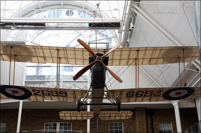 이 날 보았던 전시품 중 단단 마음에 쏙 들었던 건 바로 1차대전 때 쓰였던 영국군의 캔버스 천 복엽기. 단단한 나무 프로펠러도, 캔버스 천도, 빈티지스러운 멋이 있지 않은가. 날개가 두 겹이나 되니 양력이 좋아 휘릭휘릭 공중 곡예를 잘 돌던 재주꾼이었다 한다.