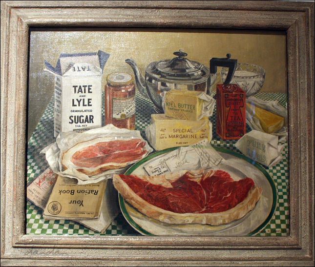 성인 한 사람의 일주일치 배급 식량을 그린 그림이 다 있어 사진기에 담아 보았다. 홍차도 보이고 살구잼과 버터도 보인다. 조지안 시대의 디자인에 아르데코 터치를 가미한 저 미래지향적 금속제 티포트는 지금도 런던 포토벨로 마켓에 가면 쉽게 구할 수 있는 것이다. 설탕 팩을 한번 보자. '테이트 갤러리'는 설탕 장사로 큰 돈을 번 테이트 씨가 세운 미술관이란 사실을 알아차릴 수 있다.