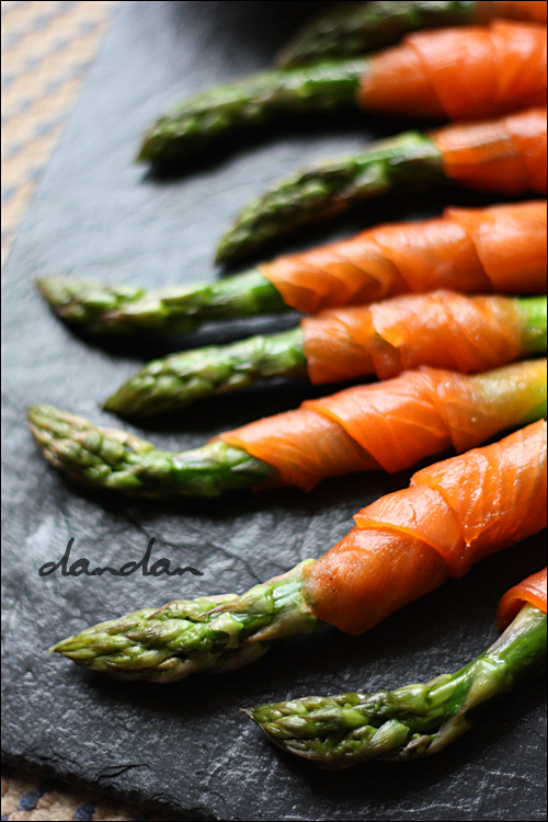 아스파라거스를 익힐 때는 물에 데쳐서 쓰는 경우도 있고, 기름 두른 지짐판에 뚜껑 덮고 찌듯이 익혀 쓰기도 하고, 줄무늬가 나 있는 무쇠 지짐판에 불자국 나도록 지져 쓰기도 하는데, 훈제연어의 저 좔좔 흐르는 윤기와 조화를 이루려면 지짐판을 쓰는 게 좋습니다. 아스파라거스에 기름막이 입혀져 훈제연어의 광택과 잘 어울리게 되거든요. 기름기가 과하게 돌지 않도록 먹기 전에는 반드시 키친타월로 표면에 묻은 여분의 기름을 한 번 닦아 주시고요. 좀 더 얌전하게 보입니다.