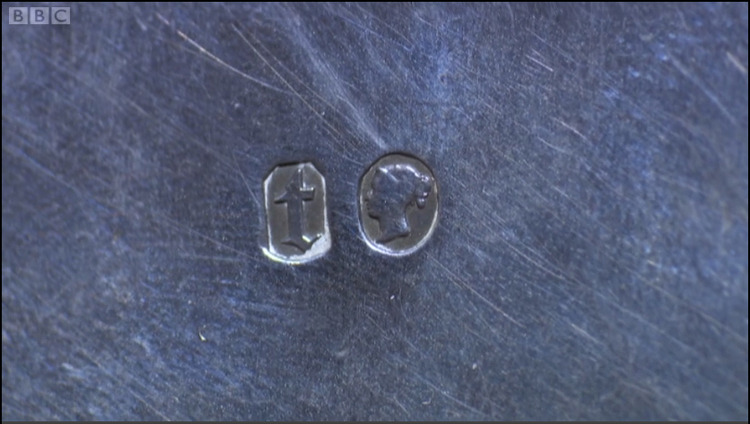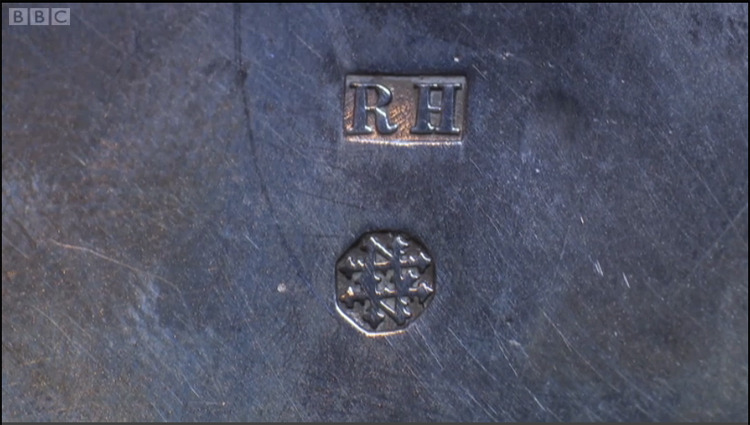 장인 이름이나 생산한 회사 이름도 새기게 돼있습니다. "RH"는 '로버트 헤넬Robert Hennell'을 뜻합니다. 연도 추정을 하면 헤넬씨 자손들 중에서도 로버트 헤넬 4세가 만든 걸로 나옵니다. 대대로 은 세공으로 유명한 집안이라죠. 더 자세한 건 전문가의 영역이니 그냥 주워듣고 공부한 대로만 읊어봅니다.