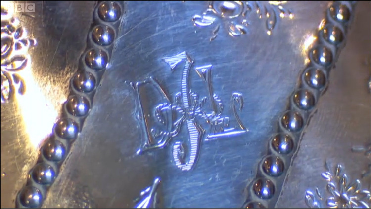 실버스미스가 주문자의 요구에 맞춰 이니셜을 새겨준 것 같네요. 리본으로 두 글자가 묶여 있는 걸 보니 결혼을 기념하여 두 가문의 이니셜을 새긴 건 아니었을까 싶기도 하고요. 식견이 부족해 여기에 대해서는 확실한 말씀 못 드리겠습니다. 하여튼 주문자가 요구해서 새긴 이니셜인 건 분명해 보입니다.