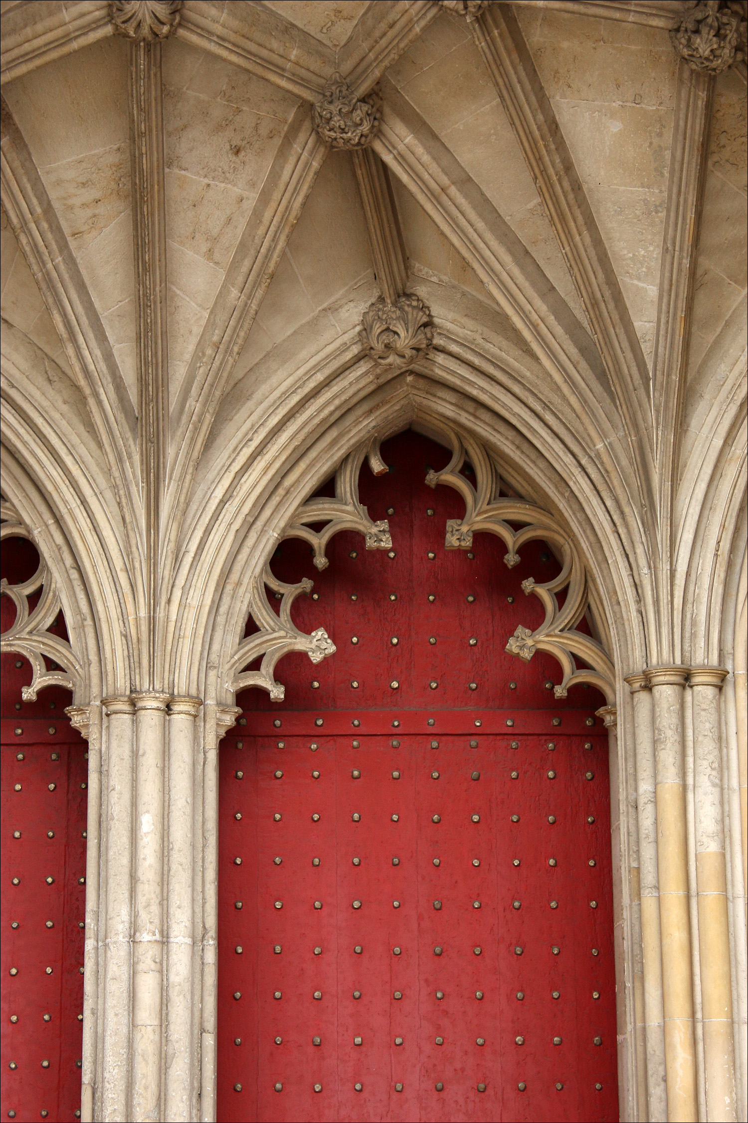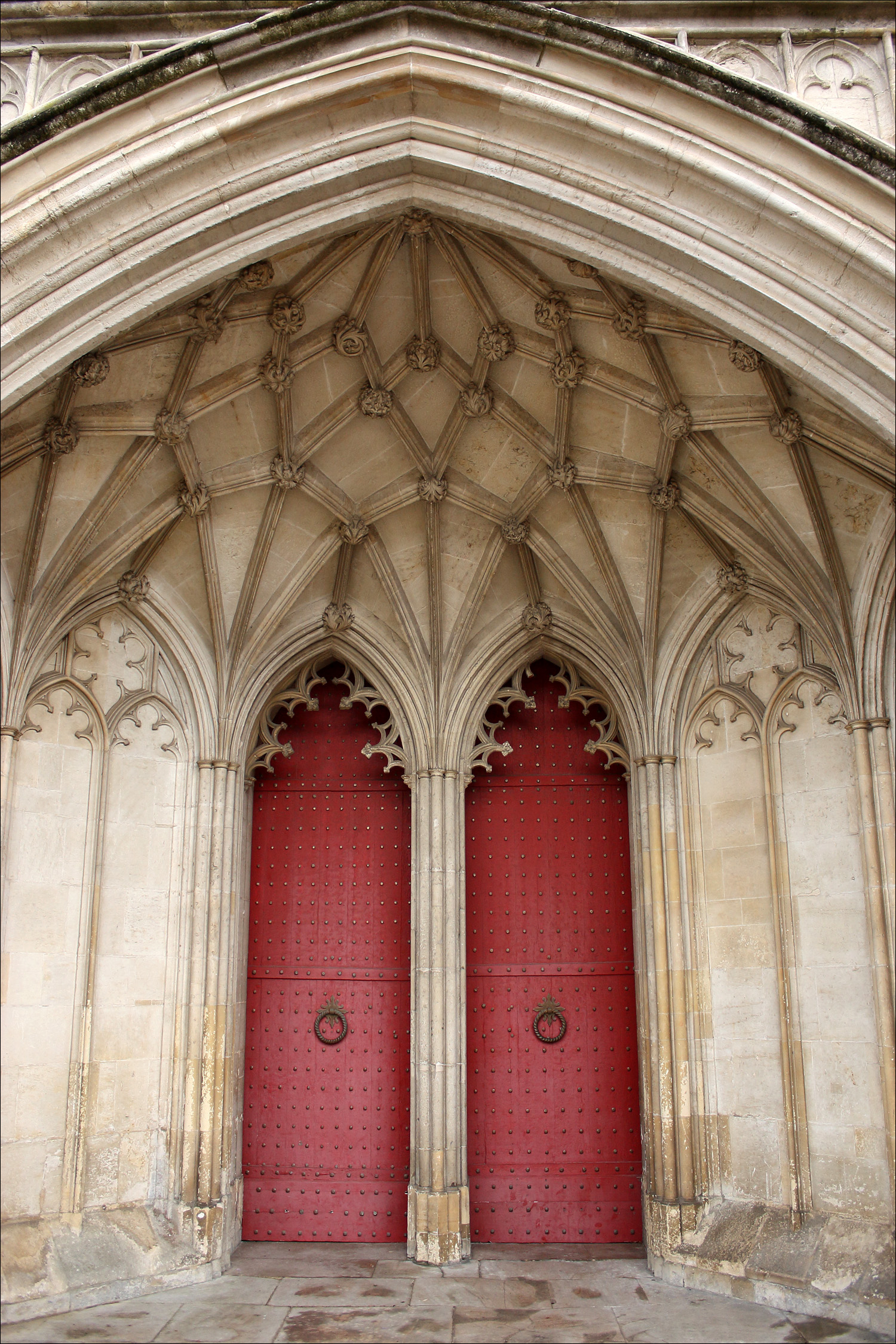 저는 이 윈체스터 대성당의 대문을 정말 좋아합니다. 보통 이런 큰 교회들의 문은 중후한 색과 거대한 크기로 위압감을 주기 마련인데, 윈체스터 대성당은 작은 문을 여러 개 두어 무게감을 덜어냈습니다. 빨간색으로 칠한 것 좀 보세요. 상식을 깹니다. 방문객을 좀 더 따뜻하게 맞이하는 듯한 느낌이 들기도 하고요. 크리스마스 때라 빨간색이 더욱 돋보입니다.