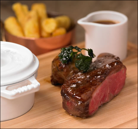 살코기를 뜨겁게 달군 번철에 앞뒤로 지진 뒤 두툼한 것은 오븐에서 마무리. '레어'나 '미디엄 레어'로 즐깁니다.
