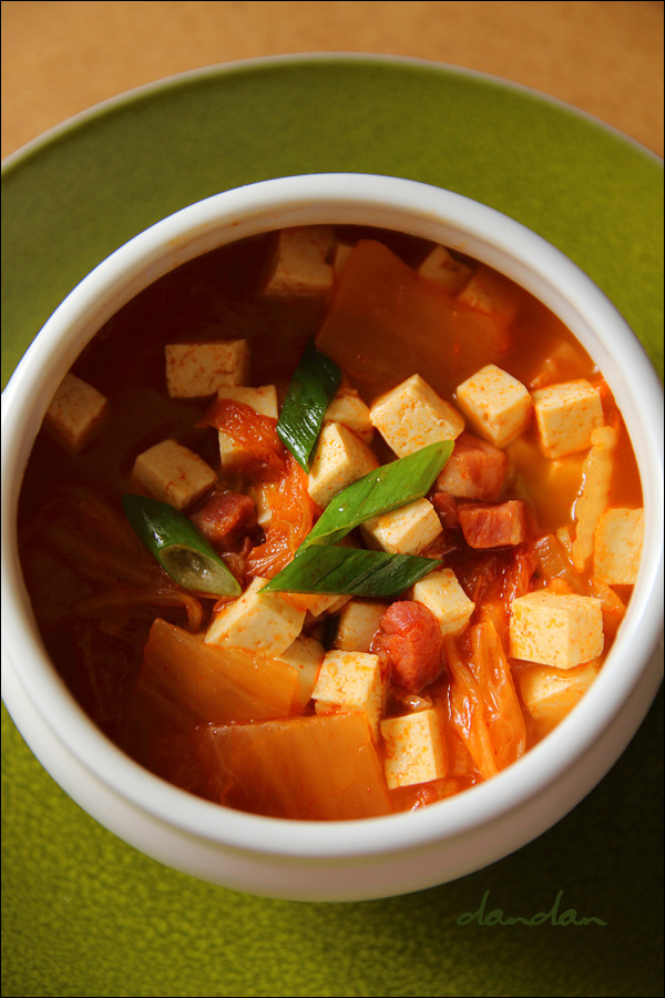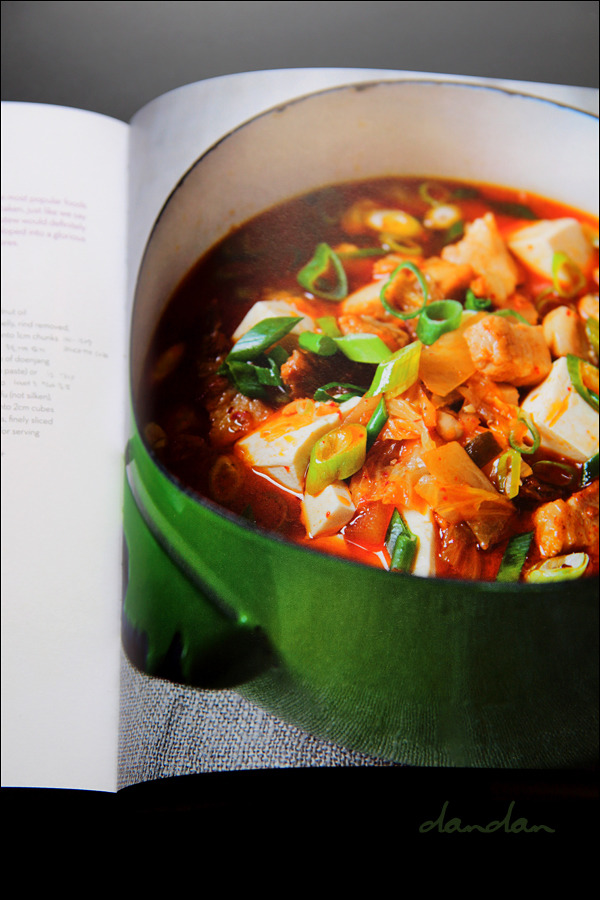 한국에서는 김치찌개 끓일 때 돼지고기를 먼저 볶아서 쓰는 집도 있고 그냥 쓰는 집도 있는데, 돼지고기를 안 볶고 그냥 쓰면 국물에 고기 맛이 우러나 국물 맛이 깊어지고 고기는 부드러워지겠지요. 반면, 돼지고기를 먼저 바삭하게 볶아서 쓰면 대신 먹을 때 돼지고기가 꼬들꼬들 씹혀 식감이 좋아지겠고요. 이 책에서는 돼지고기를 볶아서 쓰라고 지시하고 있는데, 서양인들은 음식 먹을 때 식감을 중요하게 생각하기 때문입니다. 두부도, 김치도, 모두 물렁물렁한 재료이니 바삭한 식감으로 균형을 맞추기 위해 돼지고기를 바싹 볶아서 쓰는 거죠. 문화의 차이라고 보시면 되겠습니다.