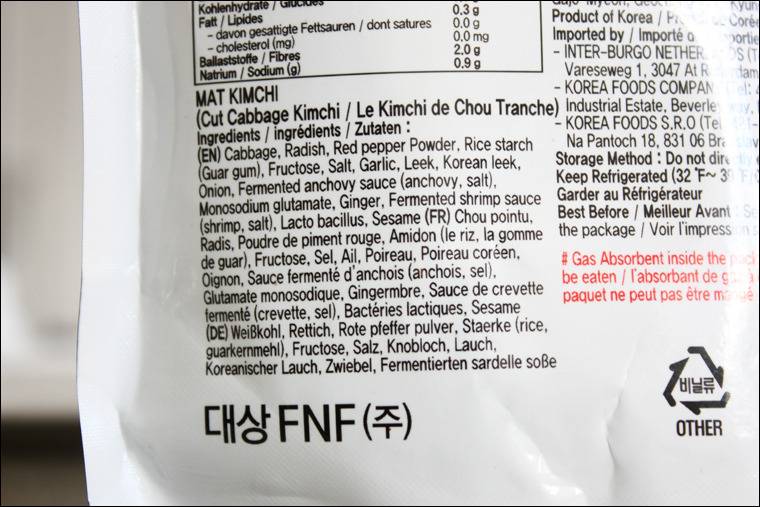 한국산 <종가집> 김치 성분을 보고 고개를 갸우뚱. 구아검, 과당, MSG, 유산균이 별도로 들어가더라고요. 김치가 발효하는 과정에서 유산균이 저절로 생기는 것 아니었나요? 유산균을 따로 넣어 준다니 신기하네요. 반칙 아닌가 싶은데. 설탕 대신 과당fructose을 넣는 것도, 구아검 넣는 것도, MSG 넣은 것도 낯설고요. 요즘 공장 김치는 다 이렇게 만드나 보죠? 김치 먹어 본 지 하도 오래돼서 제가 김치에 대한 감각을 잃어버렸습니다.