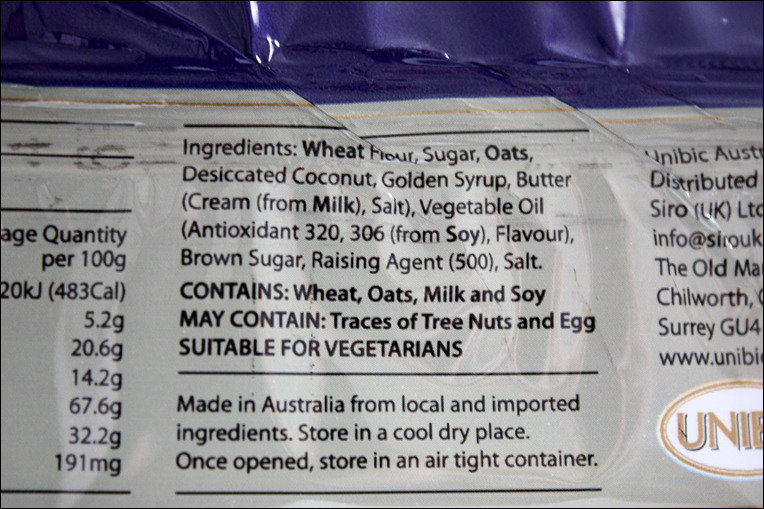 대량생산하는 공장 과자이니 성분은 뭐 너무 기대하시지 않는 게 좋아요. 첨가물이 잔뜩 들었는데, 주 재료에 귀리oat와 골든 시럽이 들었다는 게 핵심입니다. 질감은 거칠지만 향은 한국에서 먹던 '빠다코코낫'과 좀 유사합니다. 말린 코코넛 채는 후대에 와서 넣은 재료 같네요. 많이 달아요. 제가 예전에 쓴 글을 참고하셔서 집에서 직접 구워 드시는 것이 맛도 더 낫고 몸에도 덜 나쁠 겁니다.