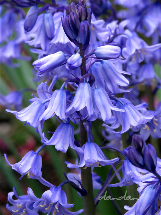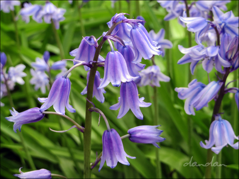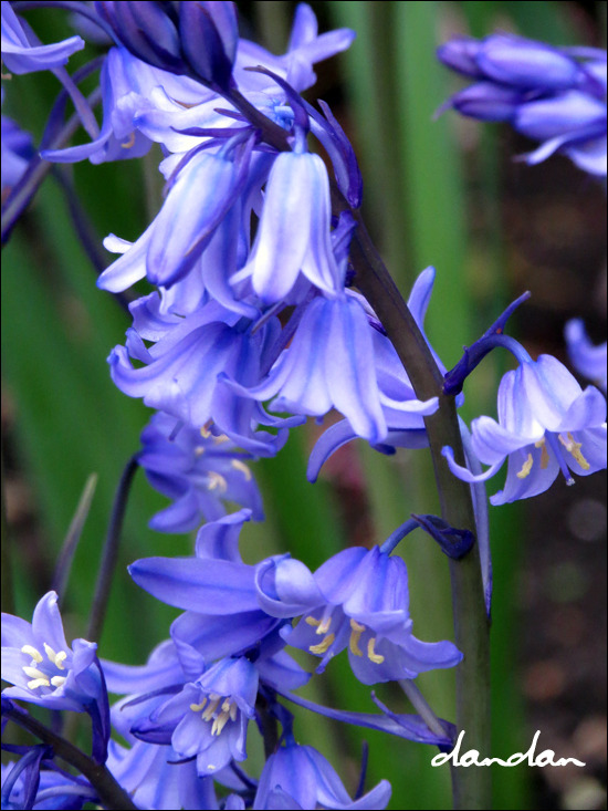 이렇게 생겼습니다. 차이를 알아차리셨나요? 스패니쉬 블루벨은 꽃이 좀더 무성하면서 꽃 방향이 제각각입니다. 영국 블루벨은 꽃잎 끝자락이 장식적으로 도르륵 말려 있고 꽃은 나란히 줄 맞춰 조로록 달려 있지요. 땅을 향해 고개를 수줍게 숙이고 있어 다소곳해 보이는데다 꽃술을 볼 수가 없으니 그 속마음을 알 수가 없어요. 마치 종이 매달린 것처럼 보입니다.