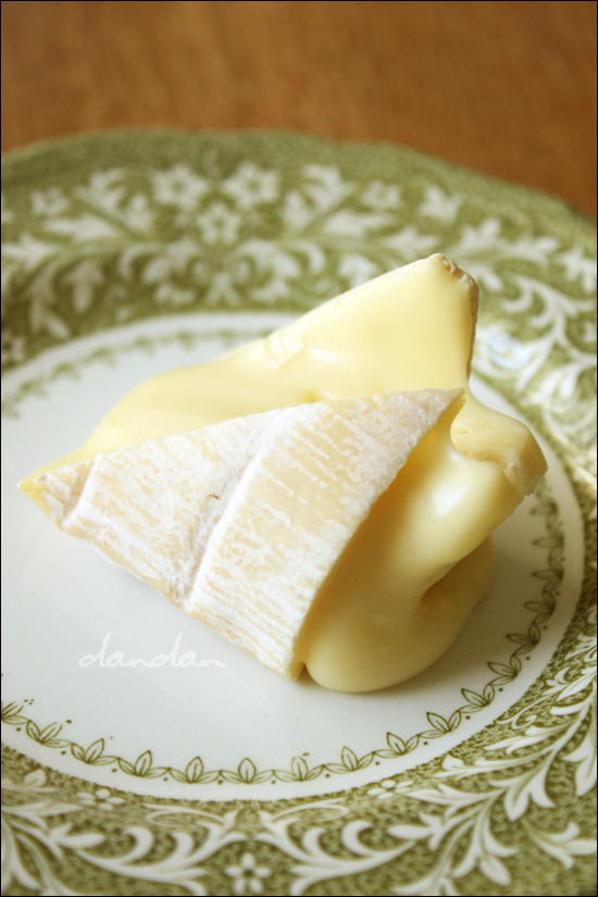 이 치즈는 수분이 많아 속살이 심하게 흐르는 치즈입니다. 냉장고에서 막 꺼내 아직 차갑고 단단할 때 먹을 만큼을 미리 썰어 두지 않으면 낭패를 볼 수 있어요. 아래 사진들을 보세요.