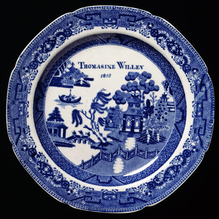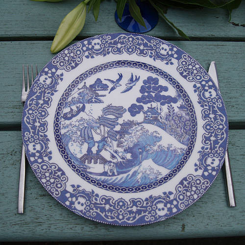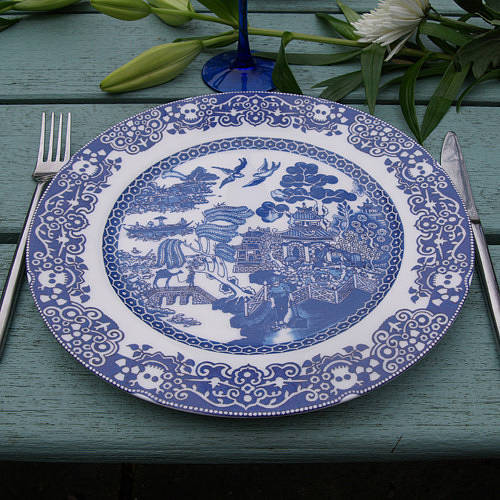 저희 집에 이런 접시가 한 장 있어요. 많이들 보셨죠? 제가 가진 것은 지름이 무려 28.5cm나 되는 큰 서빙 디쉬입니다. 중국음식을 푸짐하게 담아 손님상에 내면 딱 좋을 크기입니다. 약간 우묵하게 패여 있기 때문에 소스 있는 중국음식을 담으면 특히 좋아요. 영국인들은 이를 '블루 윌로우 패턴', 혹은 그냥 '윌로우 패턴'이라 부릅니다. 예전에 소개해드렸던 ☞ 아시아틱 페전트Asiatic Pheasant 패턴과 함께 영국에서 가장 사랑 받았던 클래식 패턴으로 꼽힙니다. 아시아틱 페전트는 19세기 빅토리안 시대 때 유행을 했었고요, 블루 윌로우는 그보다 좀 더 전인 18세기말 조지안 시대 때 창조돼 유행을 했었습니다. 18세기에 유럽에 중국 취향Chinoiserie이 대유행을 한 적이 있어요. 지금도 그 시절에 지어진 건축물 안에는 중국풍 가구나 소품들이 많이 놓여 있곤 합니다. 이 접시도 그 때의 유행을 반영하고 있는 것이지요.