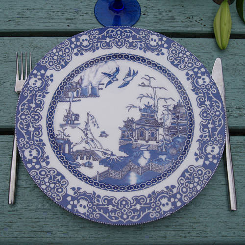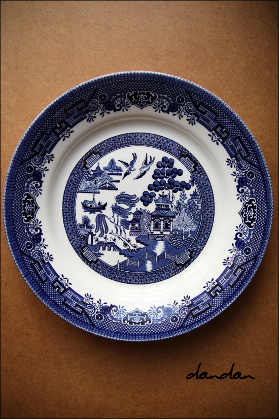 시대마다 사람마다 이야기가 조금씩 다르긴 하지만 큰 틀은 대략 이렇습니다. 원래 있었던 중국의 전설이냐고요? 아니오. 민튼 사가 이 접시를 낼 때 판매 촉진을 위해 지어낸 이야기입니다. 꽈당 덕분에 참 많이 팔았다고 하죠. 그런데, 아래의 접시를 보세요.