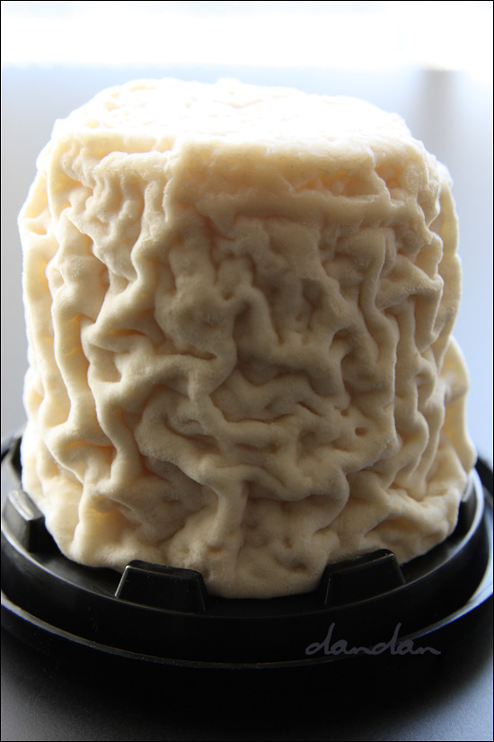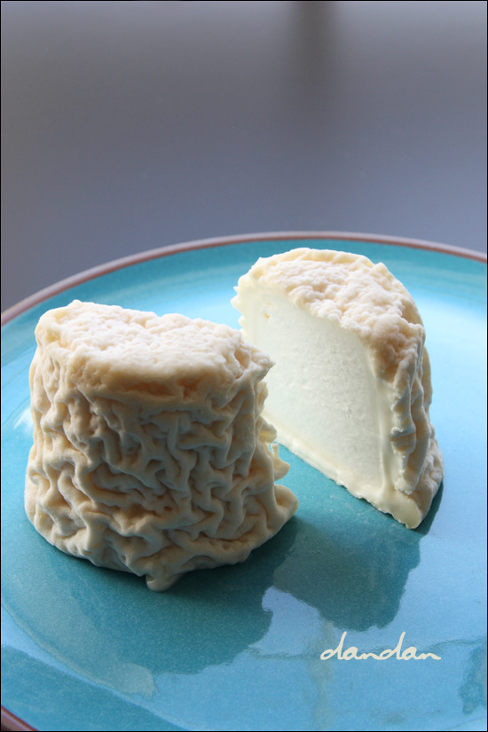 무시무시한 생김새와는 달리 껍질의 맛과 향은 강하거나 부담스럽거나 하진 않습니다. 기분 좋을 정도의 약한 쓴맛과 신맛이 느껴집니다. 껍질 밑의 흐르는 부분에서는 고소한 버터 맛이 물씬 납니다. 산미가 느껴지는 속살과는 맛이 전혀 다릅니다. 다쓰 부처 입맛에는 비슷한 크기의 프랑스 염소젖 치즈인 ☞ 발랑세보다는 맛과 질감 모두 낫네요. 무게당 값도 좀 더 싸고 외모도 더 특이하고요. 특히, 발랑세가 가지지 못한 껍질 씹는 맛이 있습니다. 발랑세보다 치즈가 약간 더 단단하면서 덜 '고티goaty'합니다. 염소젖 특유의 맛이 아주 안 나는 건 아니지만 발랑세에서 나는 그 발냄새 나는 남정네의 비에 젖은 양말 냄새와 막걸리 냄새가 안 납니다[발랑세 = 발냄새]. 단맛이 염소젖 경성 치즈들만큼은 안 나지만 어쨌거나 맛있는 치즈입니다. 뇌처럼 생긴 징그러우면서 특이한 외모도 마음에 쏙 듭니다.