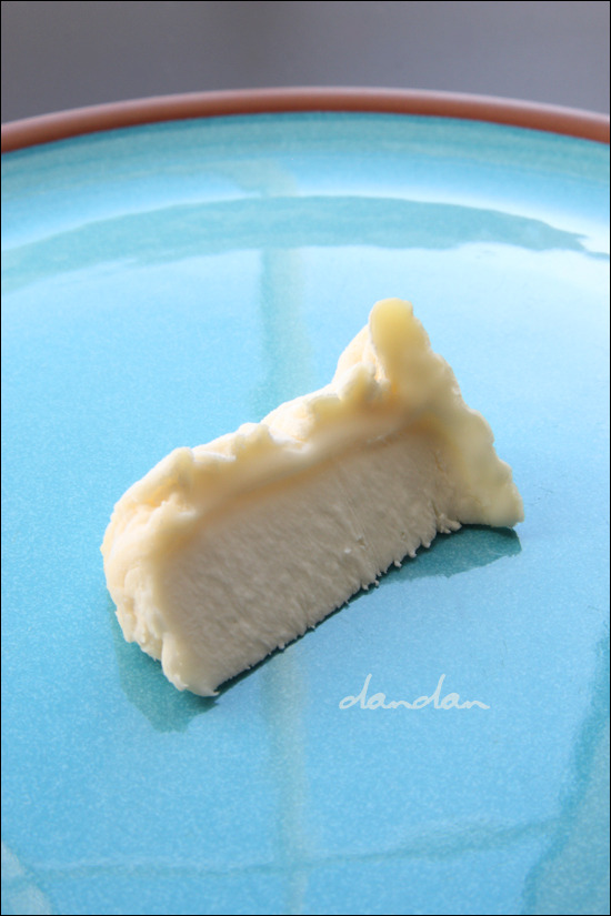치즈 포장 문구에 있던 그 "mould ripened"라는 표현은 이렇게 반을 갈라 속을 보면 단번에 이해가 됩니다. 대개의 치즈들은 공기에 항상 닿고 있는 껍질이 가장 단단하고 가운데로 갈수록 촉촉하기 마련인데요, 이렇게 외피에 흰곰팡이가 있는 치즈들은 겉에서 안으로 숙성돼 들어가는 것들이 많아 가운데 속살보다는 오히려 껍질 바로 안쪽이 숙성이 먼저 돼 물처럼 흐릅니다. 이런 치즈들은 저 물처럼 흐르는 껍질 바로 아래 부분의 질감이 정말 관능적입니다. 맛도 좋고요. 가운데 속살은 아직까지 껍질의 곰팡이와 미생물 기운이 덜 미쳐 단단하면서 보슬보슬합니다. 숙성이 좀 된 치즈들은 어린 치즈들보다 속살의 밀도가 더 높아집니다.