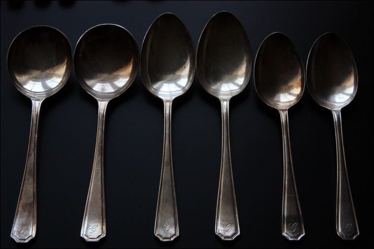 스푼들만 따로 모아 봅니다. 왼쪽부터 수프 스푼, 테이블 스푼, 디저트 스푼입니다. 저 동그란 수프 스푼은 1900년경에 등장했습니다. 그 전까지는 테이블 스푼으로 수프를 떠먹었습니다. 수프 스푼이 등장하고 나서 테이블 스푼은 서빙 스푼으로 용도가 차츰 변했는데, 옛날 테이블 스푼은 사진에 있는 테이블 스푼보다 훨씬 컸기 때문에 서빙 스푼으로도 손색이 없습니다.
