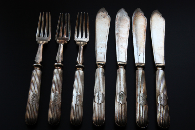 이건 생선용 포크와 나이프입니다. 테이블 포크나 나이프보다 크기가 작고 좀 더 장식적이죠. 빅토리아 시대 때 대유행을 했다가 지금은 거의 자취를 감췄습니다. 요즘은 그냥 테이블 포크와 나이프로 고기, 생선, 채소를 다 아우릅니다.