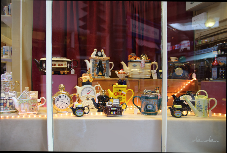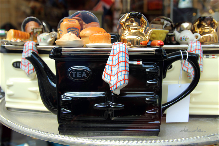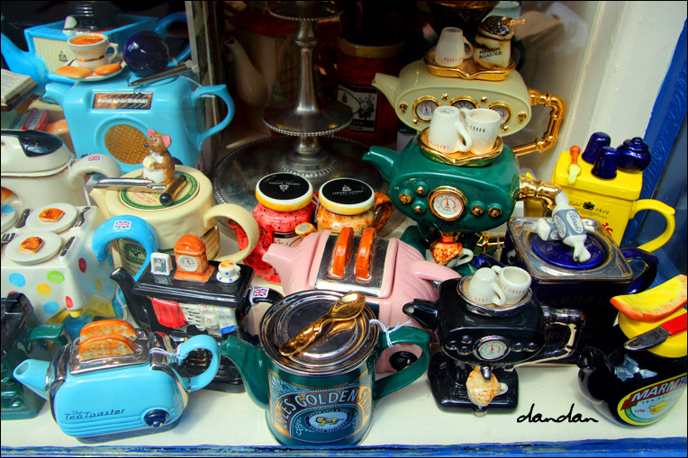 일상용품 모양을 한 이런 재미있는 티포트들을 '노벨티 티포트novelty teapot'라고 부릅니다. 실제로 사용하기보다는 장식으로들 쓰는데, 티룸에 가면 많이 볼 수 있어요.