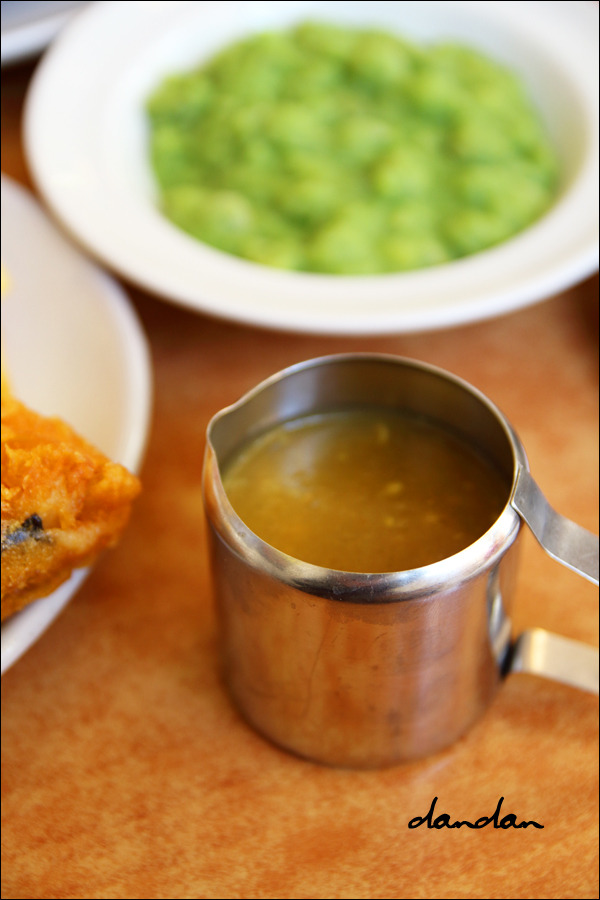 반을 잘랐을 때 뜨거운 김과 함께 훅 올라오는 연하고 향긋한 생선향과 고소한 튀김향. (으흠~) 둘 다 튀김옷은 바삭하고 생선살은 수분이 많아 촉촉합니다. 생선튀김이 정말 크고 실하죠. 이 맛에 영국 생선튀김을 먹는 거지요. 튀기는 동안 수분 많은 생선에 반죽이 얌전히 붙어 있게 하는 것도 기술이 좀 필요하겠습니다. 반죽은 전통식으로 그냥 스파클링 워터에 몰트 비니거를쓴 것 같아요. 맛을 보니 맛있기는 하나 비어 바터beer batter가 아닙니다. 이것도 전통 바터냐, 현대식 비어 바터냐로 파가 갈립니다. 다쓰 부처는 비어 바터파입니다.