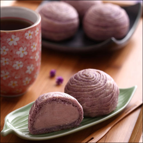우표에는 빠졌지만 제가 가장 궁금해하는 대만 과자는 자색 대만 토란taro으로 만든 타로 케이크 '이터우쑤'입니다. 연보라색 과자라니, 색도 곱고 결도 참 예술적으로 잘 냈죠. 대만 제과인들 기술이 좋네요. 개화하기 전의 꽃봉오리 같습니다. 겉은 가볍게 바스라지는 페이스트리, 속은 고구마와 팥앙금을 합친 듯한 맛의 많이 달지 않은 타로 소로 채운다고 합니다.