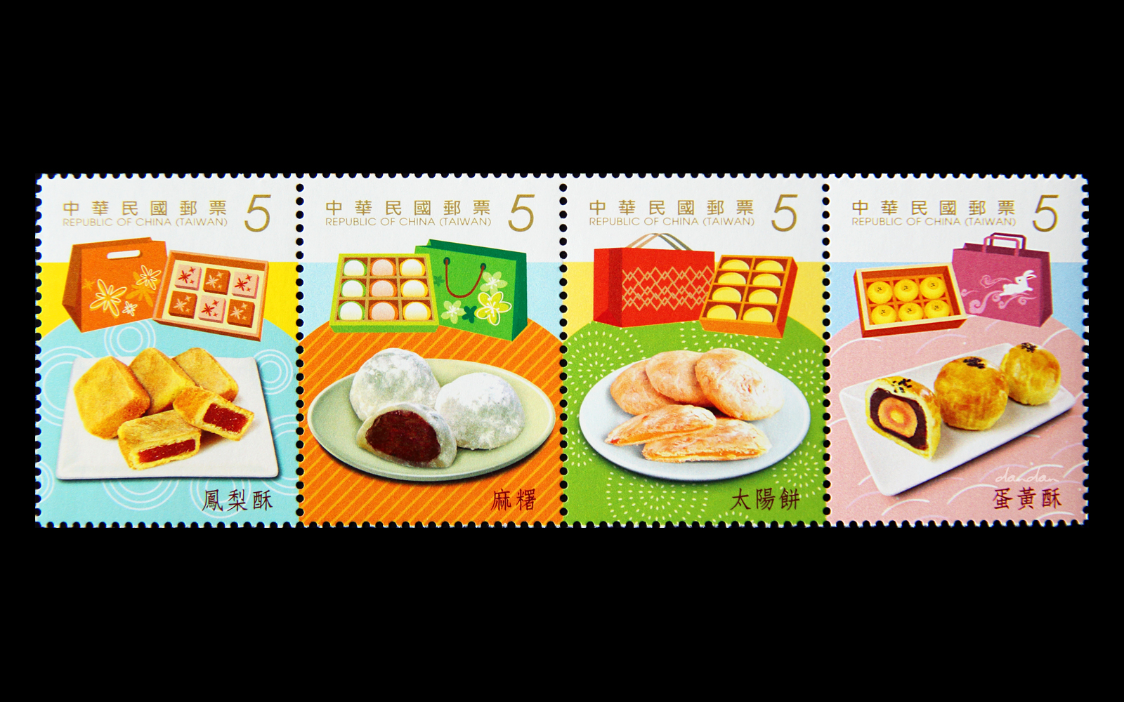 In a follow-up to the 2013 "Signature Taiwan Delicacies Postage Stamps" series – Home Cooked Dishes and Gourmet Snacks – Chunghwa Post will issue another set of four stamps, featuring popular gift-packaged desserts. Each stamp is denominated at NT$5. The designs follow: