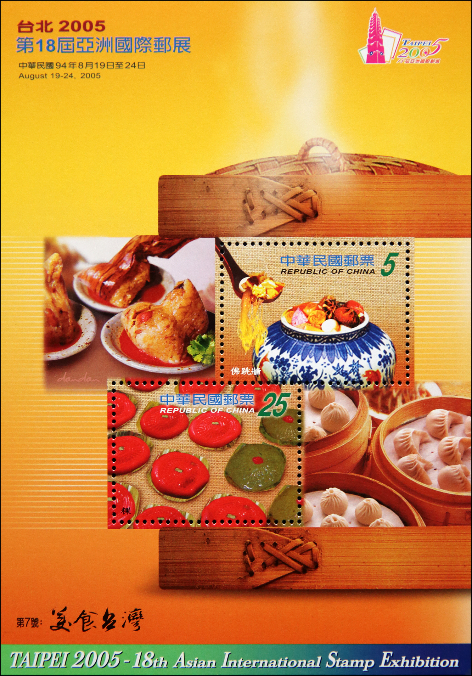 2005년 대만의 수도 타이베이에서 아시아 국가들이 모여 우표 박람회를 개최한 적이 있었는데 이를 기념해 대만에서 발행했던 우표입니다. 대만 음식이 이것저것 담겨 있네요. 우표는 두 장이지만 음식은 다섯 가지가 소개돼 있습니다.