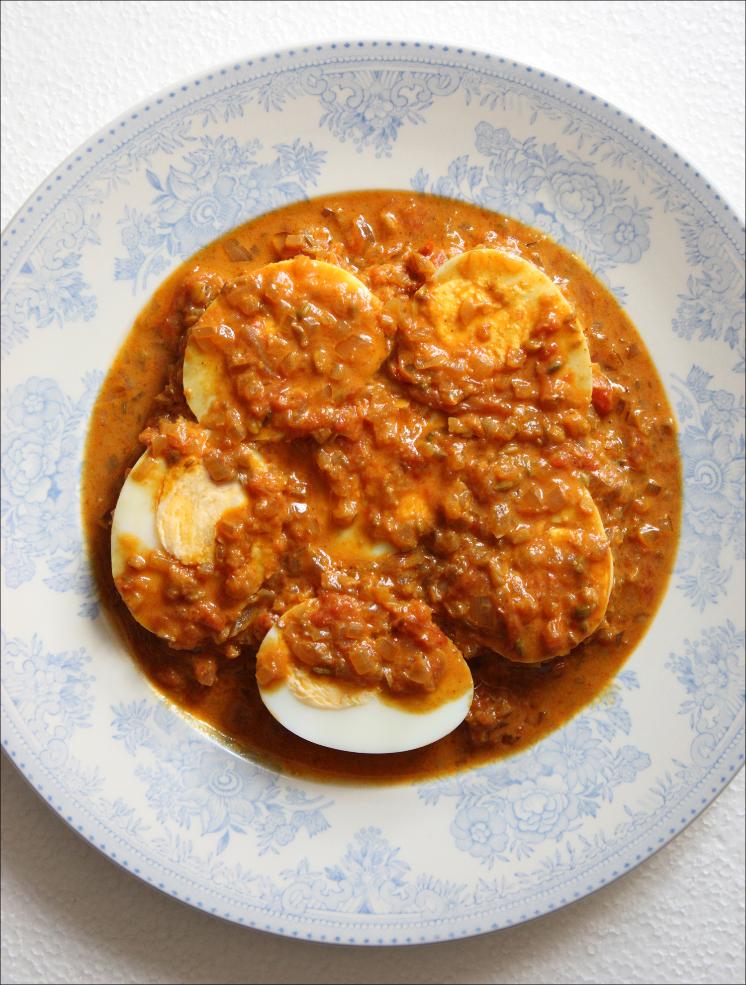 10. 삶은 달걀을 반 갈라 접시에 담고 커리를 끼얹어 낸다. 그냥 먹어도 좋고, 인도 빵들과 함께 먹어도 맛있다. 맵지 않고 단맛이 많이 도는 향기로운 커리이다. 영업집 같은 좀 더 고운 질감을 원하면 완성된 소스를 블렌더로 갈아주면 된다. 끝.