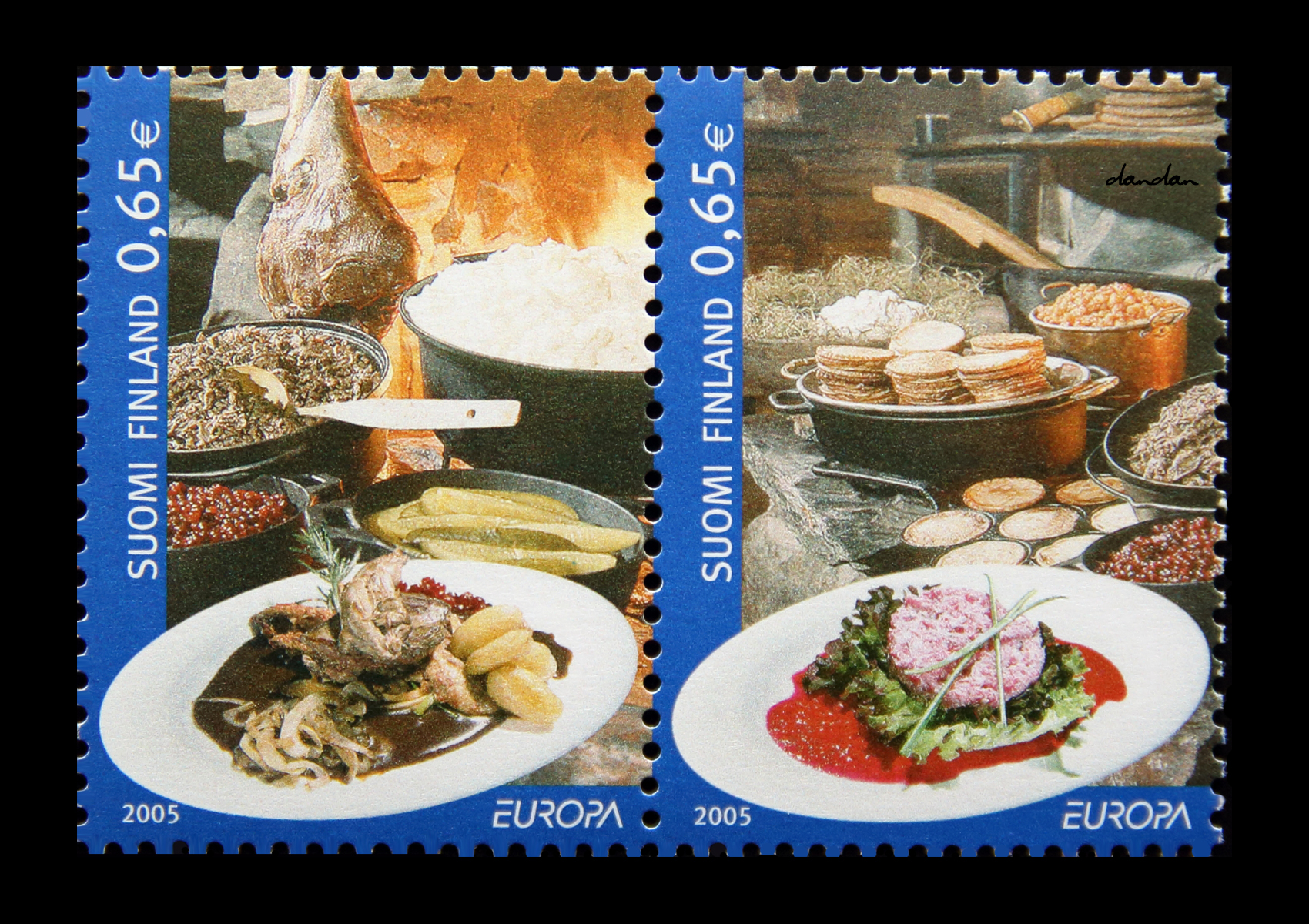 우표에 음식 이름이 안 써 있어서 무슨 음식인지 알 길이 없습니다. 꽈당 누리터를 헤집고 다녀도 모르겠어요. 핀란드 우체국까지 가서 뒤져 보았으나 정보가 없습니다. 하는 수 없이 핀란드 음식 사진들을 주욱 펼쳐 놓고 대조를 해보고 있는데, 우표 인쇄 기술이 한국보다 달리는지 인쇄 품질이 좋지 않아 음식을 알아보기도 쉽지가 않습니다.