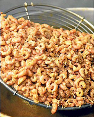 먼저, 껍질을 깐 생 브라운 쉬림프를 이런저런 향신료와 소금 넣고 끓인 맛버터에 알맞게 익힙니다.