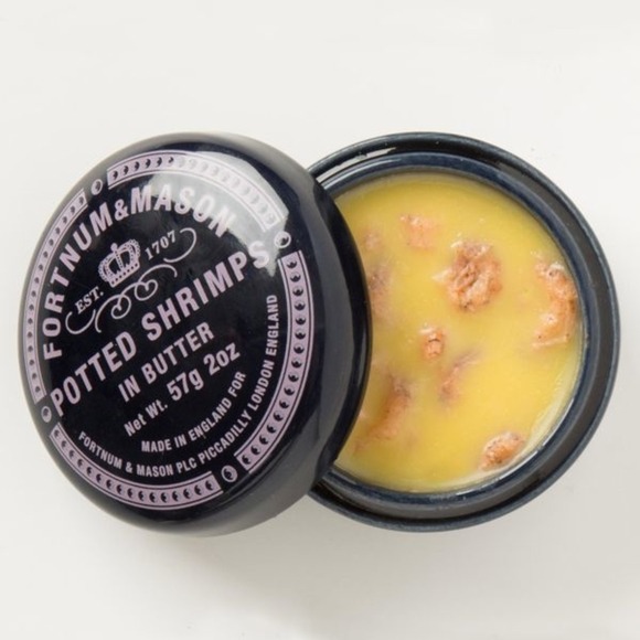 영국의 국민음식인 이 포티드 쉬림프는 수퍼마켓뿐 아니라 포트넘 앤 메이슨, 해로즈 같은 고급 백화점들도 취급을 하고 델리 숍들도 취급을 합니다. 백화점들은 '격'을 생각해 일회용 플라스틱 용기 대신 묵직한 도자기 포트에 담아 팝니다. 5월과 6월이 영국의 소위 '사교 시즌'이고 피크닉 철인데, 이때 근사한 햄퍼hamper에 담아서 갖고 나가 즐기기도 합니다. 풀밭에 담요 깔고 앉아 토스트 위에 얹어 먹습니다.