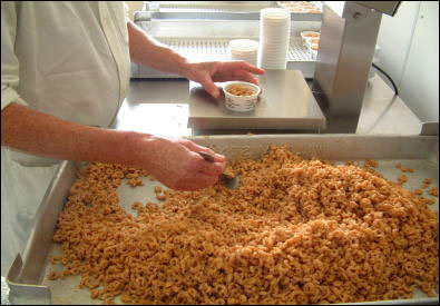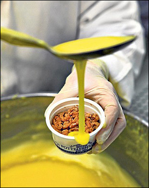 그런 다음 새로 끓여 녹인 버터를 부어 공기를 차단시킨 뒤 찬 데 두거나 냉장해 굳힙니다. 집에서 만들 때도 같은 방법을 써서 하면 됩니다. 저도 집에서 자주 만들어 먹어요.