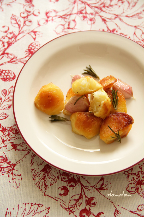 이 사진에 보이는 것에서 한 10분쯤 더 구워주어야 알맞은 색과 질감이 됩니다. 저는 올리브 오일과 로즈메리로 맛을 냈습니다. 영국에서 로스트 포테이토에 가장 많이 쓰이는 향초가 로즈메리라서 이걸로 선택했는데, 과연 탁월한 선택이었습니다.
