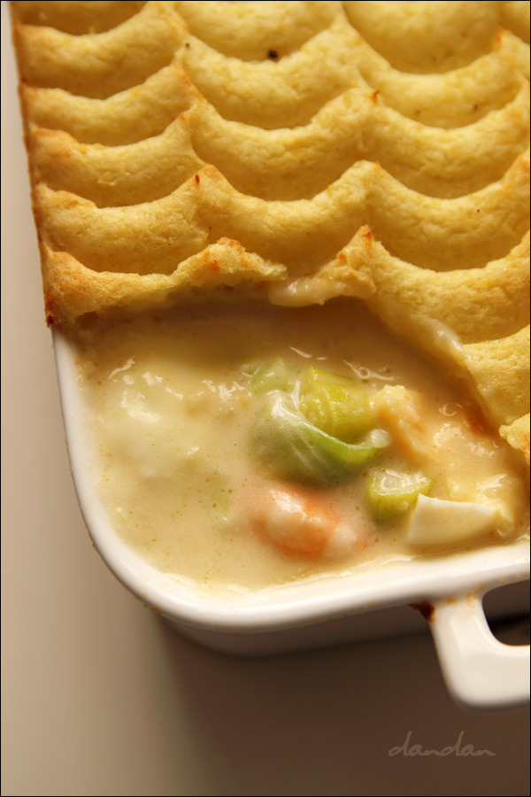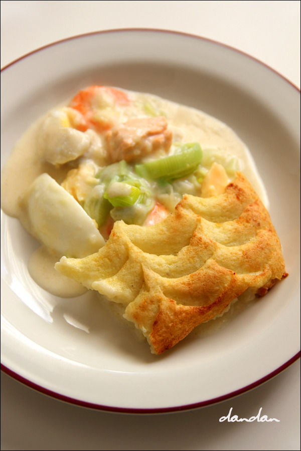 • 매쉬트 포테이토 1kg [껍질 벗긴 감자 1kg을 삶아 곱게 으깬 뒤 소금, 후추, 더블 크림(혹은 우유), 달걀 노른자 2~3개를 넣고 잘 섞어서 만듭니다. 덮다 보면 1kg가 다 쓰이지 않고 남을 수도 있습니다. 저는 많이 남았습니다. 남은 매쉬는 남은 생선살과 합쳐 피쉬케이크로 만들어 드세요.]