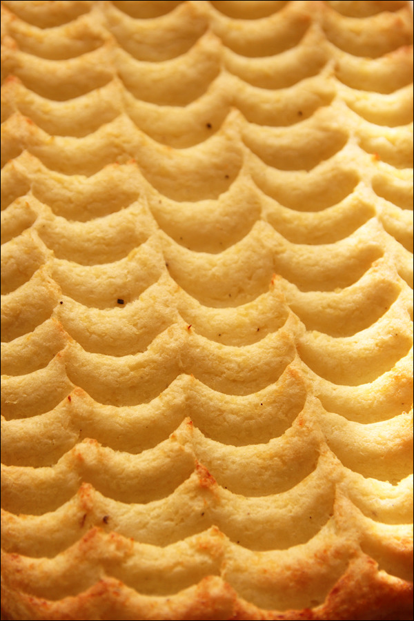10. 매쉬트 포테이토를 고르게 깔고 물에 적신 스패츌라로 표면을 꾹꾹 눌러 생선 비늘 무늬를 낸다. [집에 스패츌라가 없으면 그냥 포크로 긁어도 됩니다. 표면적을 넓혀 줘야 바삭해지니 뭐라도 무늬를 내보세요.]