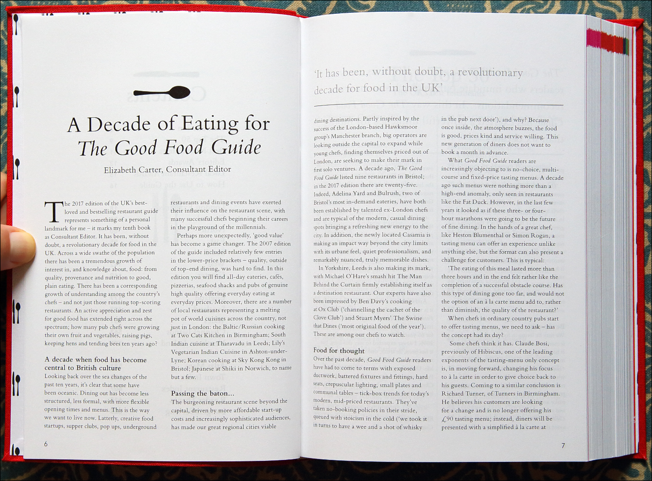 편집 고문consulting editor의 인사말과 개관입니다. 지난 10년간 영국의 외식 현장이 어떻게 변했는지를 간략하게 서술합니다. 과거 외식이란 특별한 날 비싼 곳에서 고급 음식을 먹는다는 개념이었는데, 이제는 격식을 벗겨 낸 편안한 분위기에서 아무때나 즐기는 쪽으로 바뀌었다는 이야기, 예약 없이 식사 시간에 무작정 가서 때로는 긴 줄까지 서 가며 먹는 식당, 부담 없는 가격대에 맛있는 음식을 선보이는 식당, 시간 구애 받지 않고 하루 중 아무때나 가서 즐길 수 있는 식당이 많이 늘었다는 이야기를 합니다. 음식의 국적들도 이전보다 훨씬 더 다양해졌고요. 런던 이외의 지역에도 실력 있는 식당들이 많이 늘었다는 이야기, 이제는 요리사들뿐 아니라 손님들도 음식에 대한 관심과 지식이 늘어 외식 업계에 좋은 자극이 되고 있다는 이야기도 합니다.
