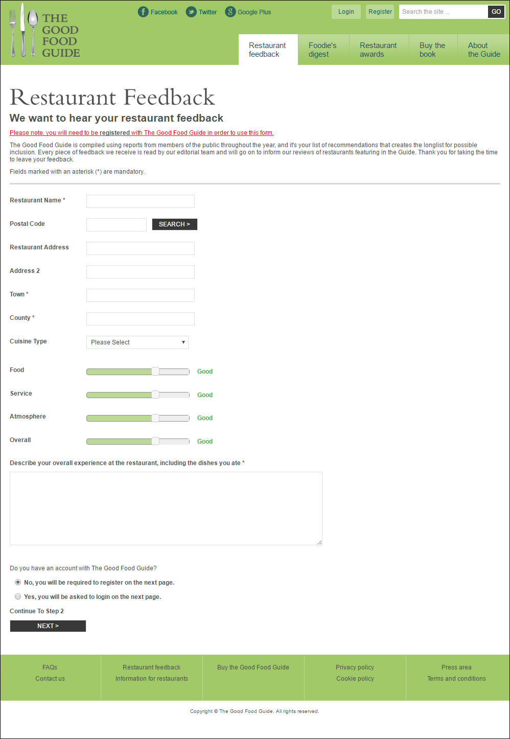 ☞ <굿 푸드 가이드> 누리집에 가면 이런 화면을 통해 누구든지 식당 평가에 참여할 수 있습니다. 다른 온라인 식당 평가 기관들처럼 인터넷 기반으로만 해도 될 텐데 굳이 종이책을 내는 이유는, 맞춤법 막 틀려 가면서 쓴 일반인들의 졸문이 아닌 훈련 받은 편집진의 제대로 된 문장으로 실물 사료를 남겨 후대의 학자들이 연구할 수 있게 하기 위해서입니다. 오늘 우리가 무심히 펼쳐 본 요리책이 미래의 음식사학자들과 요리사들에게는 얼마나 귀한 사료가 될지 다들 잘 아실 겁니다. 음식의 원조를 가릴 때도 대개 맨 처음 실렸던 요리책을 놓고 따지곤 하죠. 식당 평가서도 마찬가지로 중요합니다. 식당은 생겼다가 사라지기도 하지만 기록을 남겨 두면 대중의 기호 변화와 식문화 동향을 살필 수 있습니다. 이 <굿 푸드 가이드>는 그래서 브리티쉬 라이브러리에도 소장이 되고, 그 안에서 열람도 가능합니다.
