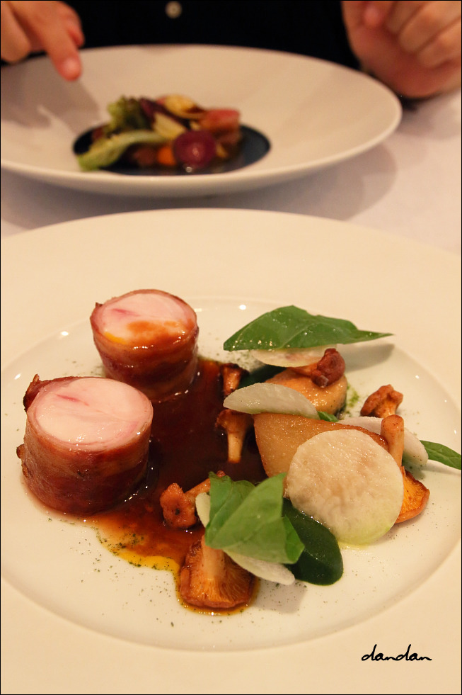 파인 다이닝 레스토랑이라서 본식에 어린 토끼young rabbit 고기를 쓰나 봅니다. 살이 적색육이 아니라 백색육에 가깝죠. 성체가 될수록, 야생일수록 고기 색이 짙어지며, 또 다른 종인 몸집 큰 산토끼hare는 훨씬 더 짙습니다. 고기 색이 짙어질수록 맛도 진해진다고 보시면 되고요. 지방이 거의 없어서 저렇게 조제 삼겹살bacon, pancetta로 겉을 싸주기도 합니다.
