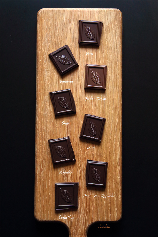 산지별로 한 조각씩만 올려 봅니다. 코코 빈 가공의 발달에 유럽 각국이 저마다 한 역할씩 했는데, (☞ 코코 빈 프랑스 땅 도달 400주년 기념 우표) 오늘날 우리가 가장 흔히 접하는 '선 따라 똑똑 부러뜨려서 먹을 수 있는 단맛 나는 판형 쵸콜렛'은 영국이 개발했습니다. 그래서인지 영국은 쵸콜렛 바에 아직도 공을 많이 들입니다. 수퍼마켓에 부재료별로, 산지별로, 브랜드별로, 정말 많은 종류의 쵸콜렛 바가 진열돼 있죠. 아래에 산지별 코코 빈 특성을 간략하게 적어 봅니다. 성분들을 눈여겨보세요.