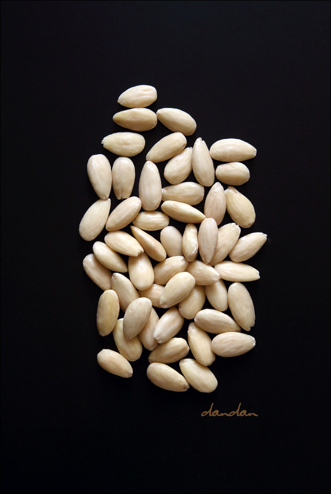 거피한 뒤 살짝 데친 아몬드도 준비해 주세요. 수퍼마켓 제과 재료 선반에서 쉽게 볼 수 있습니다. 'Blanched whole almonds'라고 써 있을 겁니다. 다소 눅눅하니 오븐에 잠깐 구워 고소한 맛도 돋우고 수분도 살짝 날려 주세요. 귀찮으면 그냥 쓰셔도 됩니다.