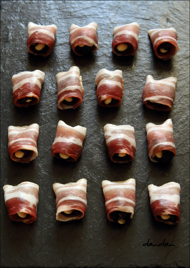 말린 자두를 오븐에 굽고 나면 신기하게도 신맛은 많이 누그러지고 잘 익은 군고구마 맛이 나게 됩니다. 자두는 달고 베이컨은 짭짤. 또, 아몬드는 바삭하고, 자두는 부드럽고, 베이컨은 꼬득꼬득. 재료는 세 가지가 전부이지만 맛과 식감이 다채로워 먹는 재미가 있고, 총합이 각 요소의 합보다 큰 음식A dish that's greater than the sum of its parts입니다. 만들기 어렵지 않으니 연말 연시 파티 음식이나 술안주로 내보세요. 익어서 투명해진 지방 밑으로 까만 자두가 비쳐 보인다고 이런 이름을 붙였나 봅니다. 색이 멋있습니다. ■