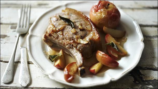▲ 버터에 튀긴 세이지 잎과 조린 사과를 곁들인 포크 촙.