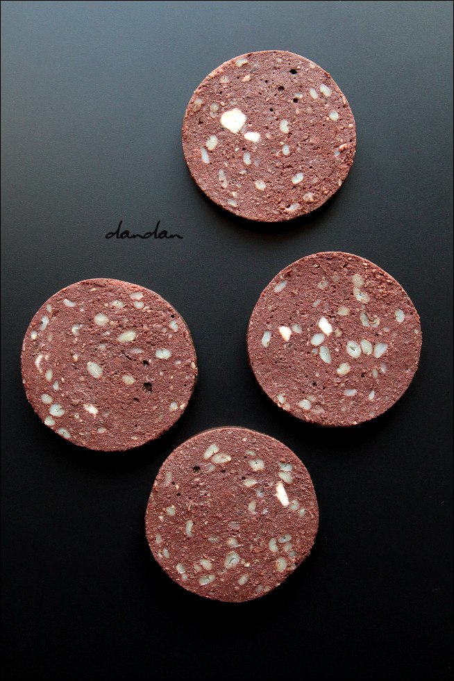 ▲ 포장에서 꺼낸 블랙 푸딩. 하얗게 박힌 것들은 귀리, 보리, 돼지 지방, 양파, 돼지 껍질.