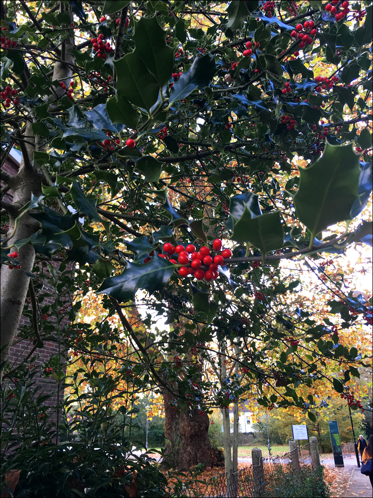 홀리는 왠지 크리스마스가 다가올수록 잎에 윤이 반짝반짝 더 나면서 열매도 더 빨개지는 것 같아요. 하도 예뻐서 길 가다 멈추고 넋을 놓고 봅니다. 다른 꽃들이 안 보이는 계절이라서 더 돋보이나 봅니다. 자기 집 정원에 심긴 것을 따다가 명절 장식을 하다니, 영국인들 소박하면서 낭만적이죠.