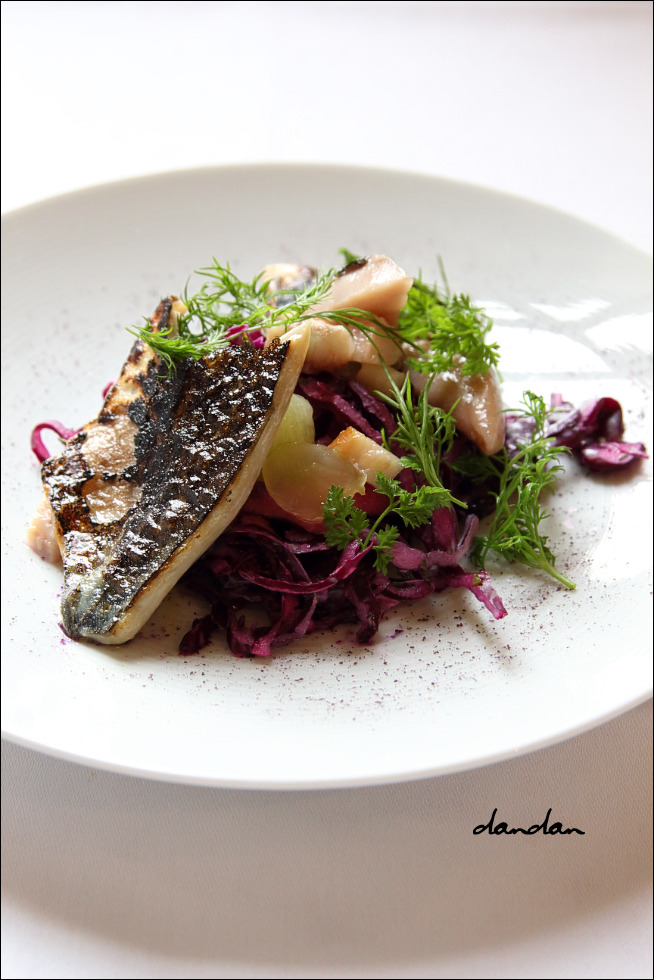 다쓰베이더의 전식으로는 양념 촛물에 절인 뒤 토치로 껍질쪽만 그을린 고등어. 훈제 장어, 적양배추 슬로, 처빌이 곁들여 나왔습니다. 영국에서는 바싹 구운 생선을 보기 힘듭니다. 생선을 참 촉촉하게 잘들 익혀서 먹는 것 같아요. 심지어 노동자 계급working class 길거리 음식인 피쉬 앤 칩스의 생선 튀김 조차도 살이 항상 촉촉합니다. 고등어에 곁들인 저 훈제 장어도 딱 알맞게 익혔고 섬세한 훈향이 일품이었습니다. 참고로, 영국에서 훈제 장어는 훈제 연어보다 비쌉니다.